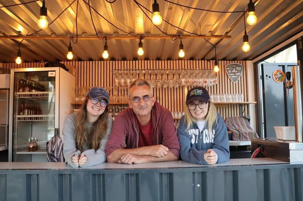 Steven Pirotais, sa fille Gaëlane (à sa gauche) et son amie Emy s’occuperont de la guinguette La Plaisance durant la saison 2025. © Ouest-France
