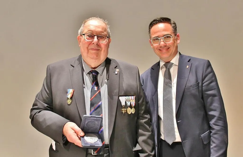 Michel Chanteau a reçu la médaille de la ville de Sablé-sur-Sarthe, remise par le maire, Nicolas Leudière, dimanche 14 avril 2024, lors du congrès départemental de l’Union nationale des combattants (UNC). © Ouest-France
