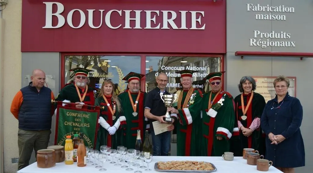 Belle animation vendredi 19 avril devant la boucherie-charcuterie de Thierry Boul, place Thiers à Malicorne. Ce dernier recevait la visite des membres de la confrérie des Chevaliers des rillettes sarthoises, après sa victoire et sa médaille d’or au 56e concours national des meilleures rillettes 2024 qui s’est déroulé les 9 et 10 février. La remise des prix a eu lieu le 10 mars.