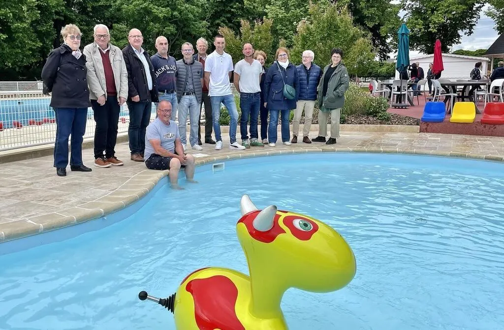 Élus et agents de la commune ont posé au bord de la pataugeoire pour la soirée de réception des travaux de la piscine, vendredi 31 mai 2024, à Précigné. © Ouest-France