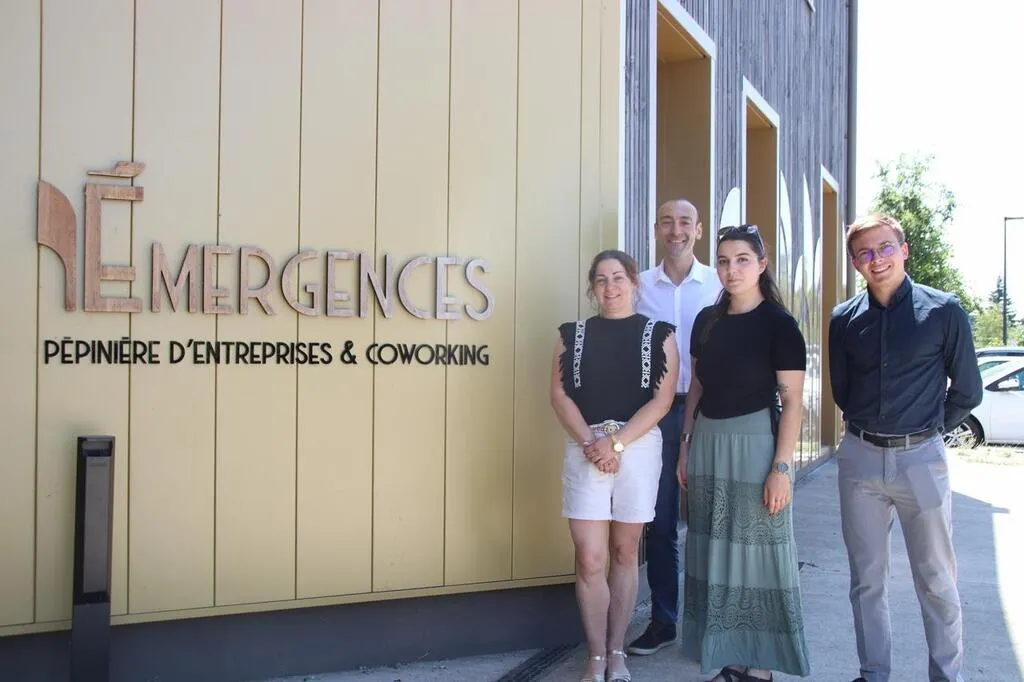 Les créateurs de WakUp Intérim devant les locaux d’Émergences avec Simon André, chargé de mission. © Le Maine Libre