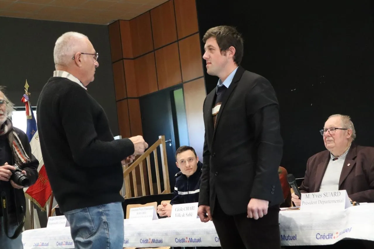 Lors de l’assemblée générale de l’Union nationale des combattants de Sablé-sur-Sarthe, Yves Suard, le président départemental, a remis la médaille de bronze du mérite à Alexandre Hubert. © Ouest-France