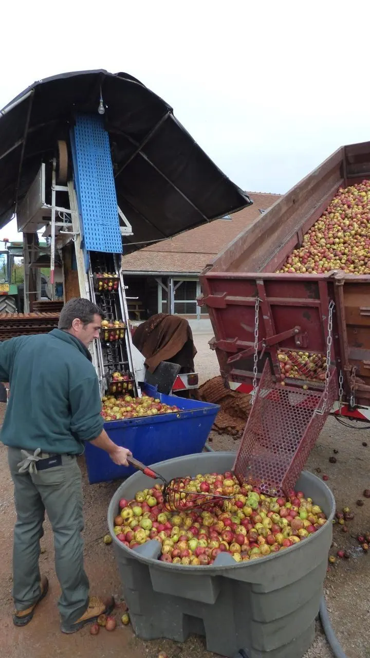 Trois tonnes de pommes passeront par le grand pressoir, qui impressionne toujours le public. © Arche de la nature