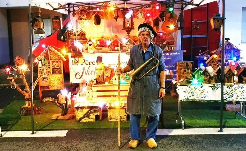 Le  père nichoirs devant son stand, lors d’une manifestation extérieure. © Le Maine Libre