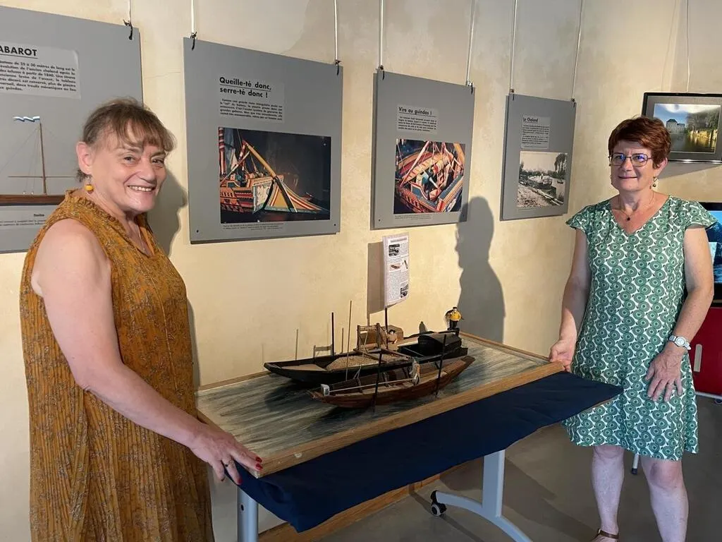 Élisabeth Niveau et Isabelle Chiaramonti-Monnet devant une maquette de moulin à eau en état de fonctionnement. © Le Maine Libre