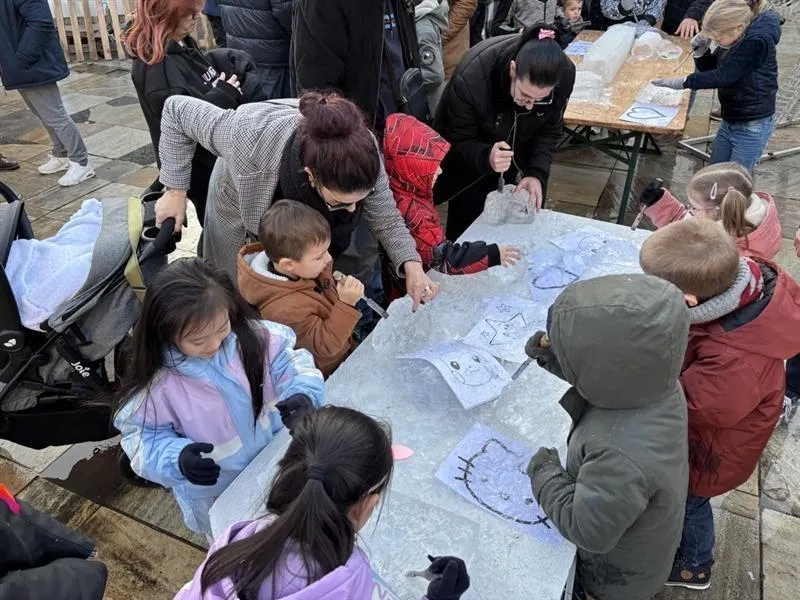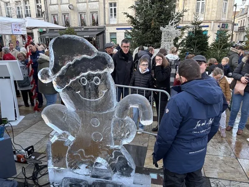 Les animations de Noël se poursuivent tout ce week-end des 13 et 14 décembre 2025 dans le centre-ville de La Flèche (Sarthe). Ce samedi, c’est un sculpteur venu du Bourget, en région parisienne, qui a transformé un bloc de glace de 300 kg en… bonhomme de pain d’épices sous les yeux ébahis du public.