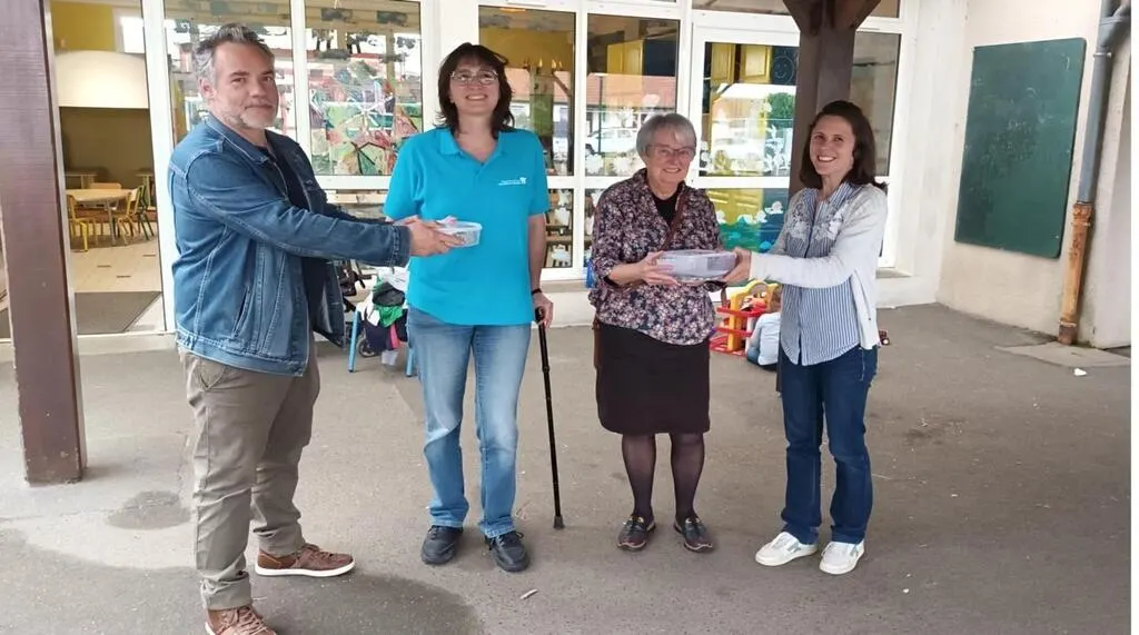 De gauche à droite : le directeur de l’école Christophe Boivin, Estelle Mille (Leucémie espoir 72), Martine Beucher (Vaincre la mucoviscidose) et la directrice Adeline Savin. © Ouest-France