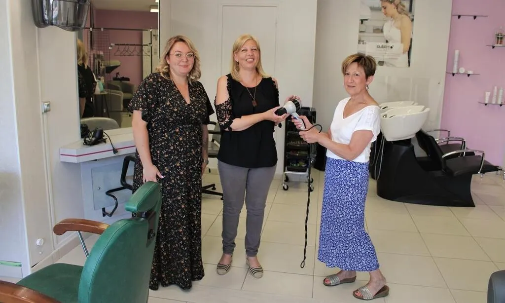 De gauche à droite : Laura Porteboeuf, Magali Hervé et Nelly Gohier, qui passe le sèche-cheveux à la nouvelle patronne du Satisf’Hair. © Ouest-France