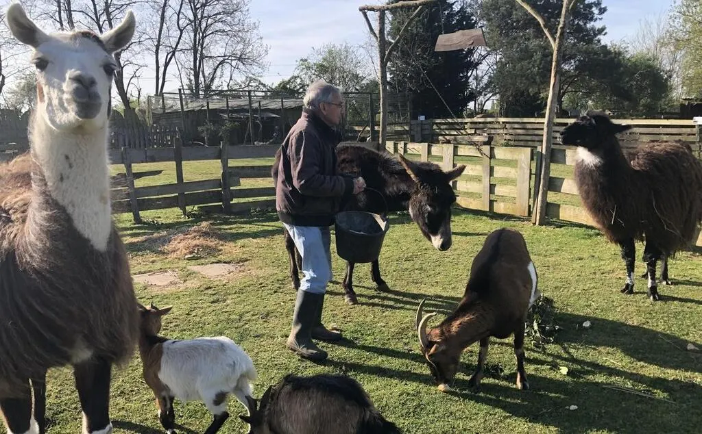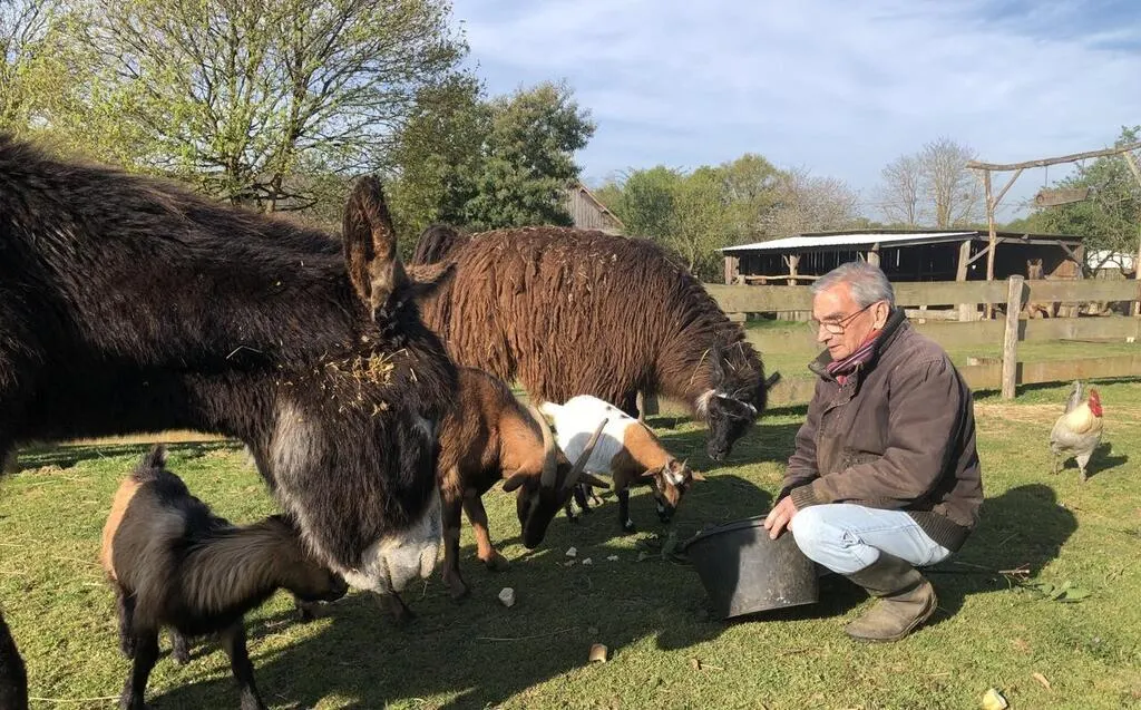 Joël et Monique Mahé prennent soin de près de 200 animaux dans leur ferme refuge de La Baronnière. Au second plan, Nazca, qui aura besoin d’une bonne séance de tondeuse dès que la météo le permettra. © Le Maine Libre