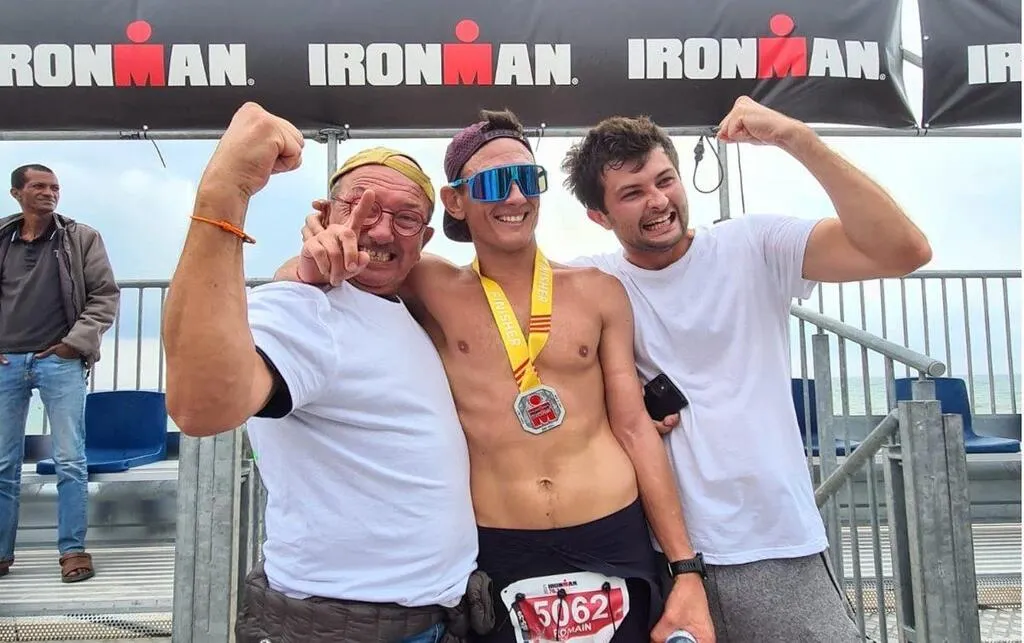 Après l’half Ironman à Barcelone, Romain entouré de son père Nicolas et de son frère Hugo. © Nicolas Massé