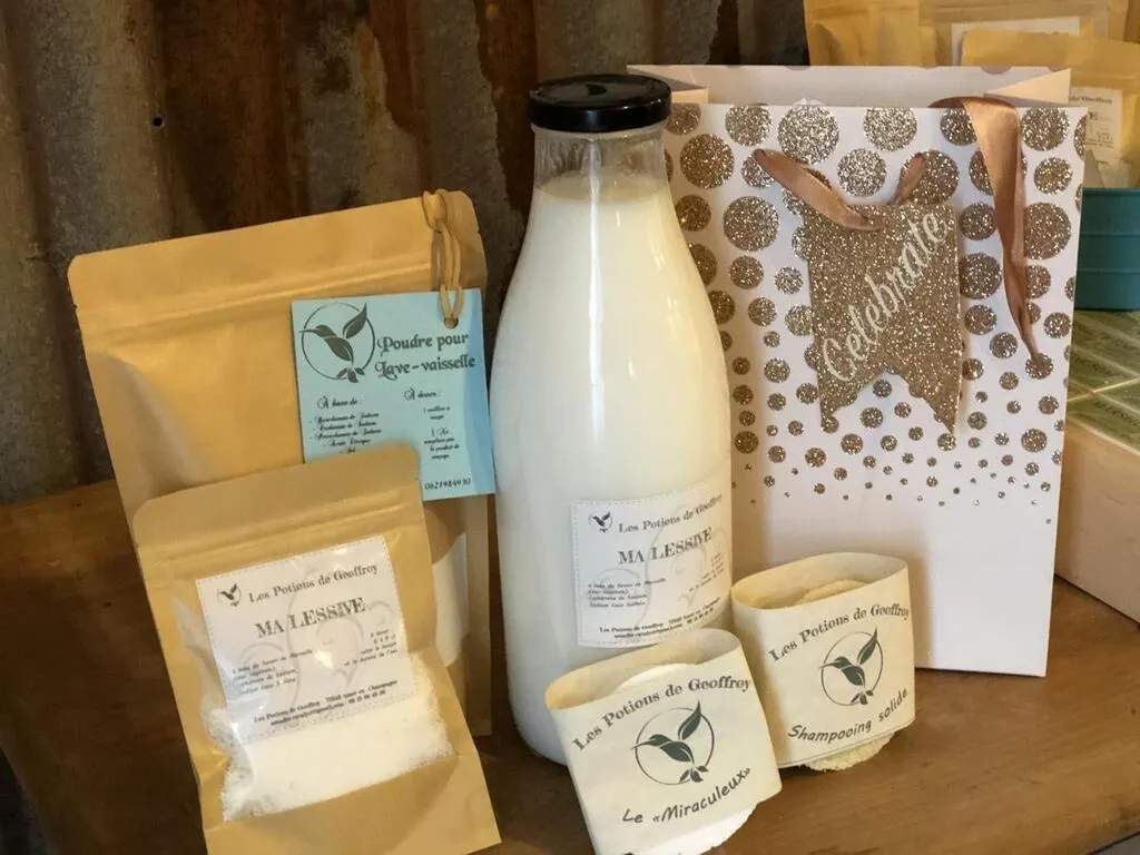 De la lessive maison, des produits ménagers, un shampoing solide… pas très glamour à première vue comme cadeau de Noël mais ce pack fait maison, est justement l’occasion de découvrir « les potions de Geoffroy »