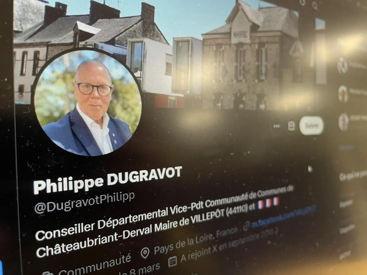 Le conseiller départemental du groupe Démocratie 44 (centre et droite) Philippe Dugravot, candidat sans étiquette aux municipales 2026 à Villepot, 700 habitants au nord de Châteaubriant (Loire-Atlantique), partage régulièrement des tweets reliés ...