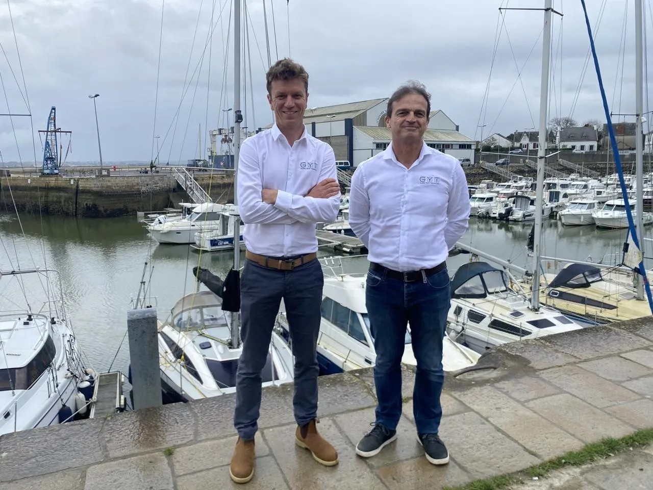 Deux des trois associés de GYT : Ulysse Harin et Ronan Guérin devant le chantier naval du Croisic (Loire-Atlantique). © Ouest-France