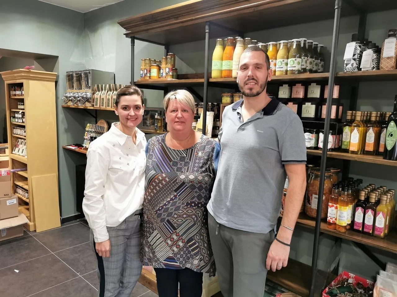 Madeline et Corentin Courtien, déjà propriétaires du restaurant La Cuisine de Mam, situé en face, entourent Catherine, la maman de Madeline, qui va gérer l’épicerie fine L’Écrin du goût. © Le Maine Libre
