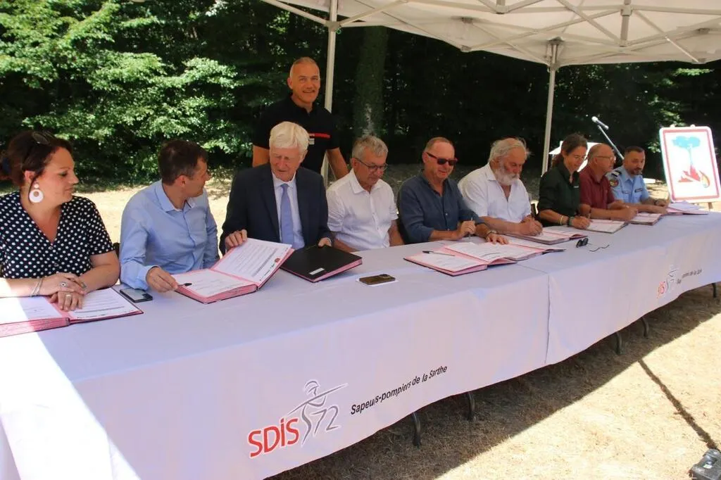 Dominique Le Mèner, président du conseil départemental de la Sarthe (3e à gauche), accompagné des élus, du colonel Christophe Frerson (SDIS 72), lors de la signature de la convention Sentinelles de la forêt. © Ouest-France