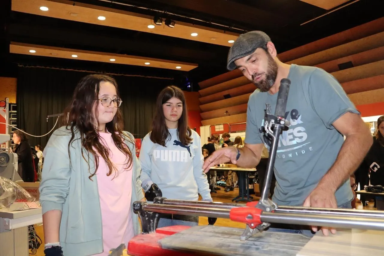 Valentin Blin, carreleur à Chantenay-Villedieu, proposait un atelier de découpe de carreaux aux collégiens et aux demandeurs d'emploi présents sur cette journée au centre culturel Courmesnil de Loué, mardi 4 novembre 2025. © Ouest-France