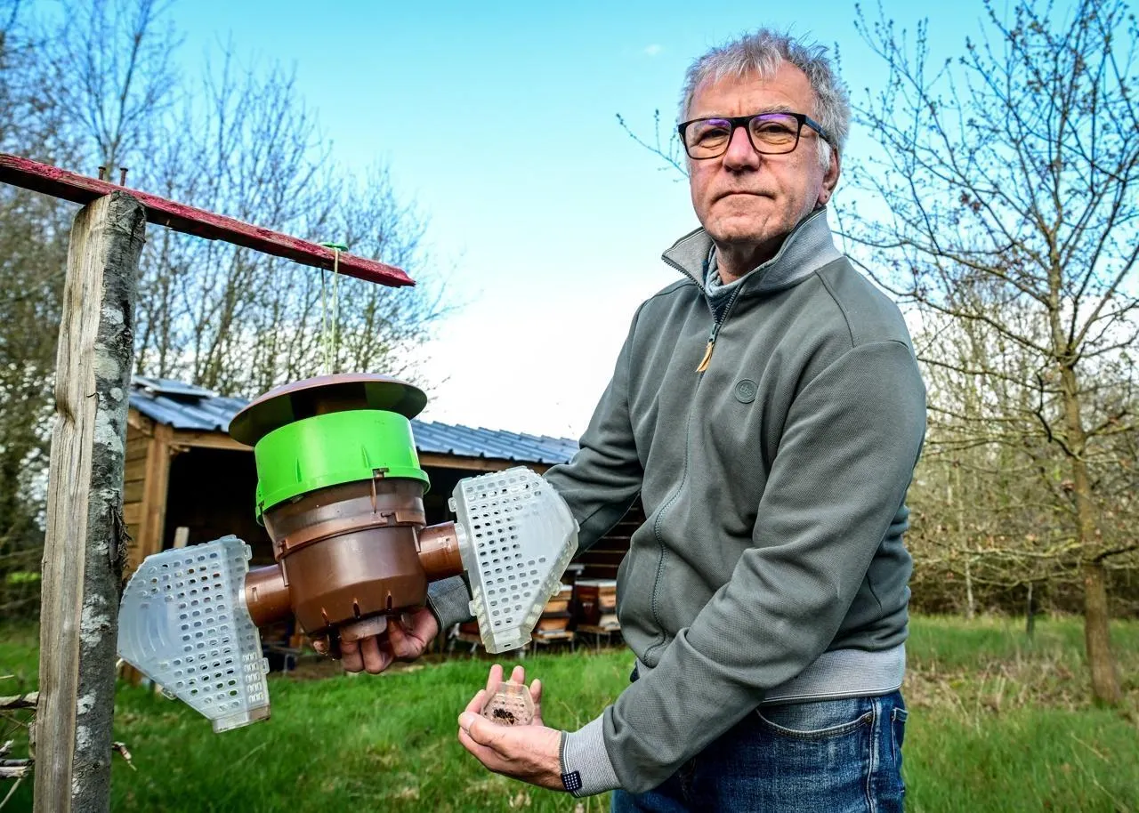 Changé, mercredi 25 mars 2026. Luc Breteau, l’un des techniciens du GDSA 72, préconise le piégeage des reines au printemps, avant que les choses ne se compliquent très sérieusement. © Le Maine Libre - Yvon LOUÉ