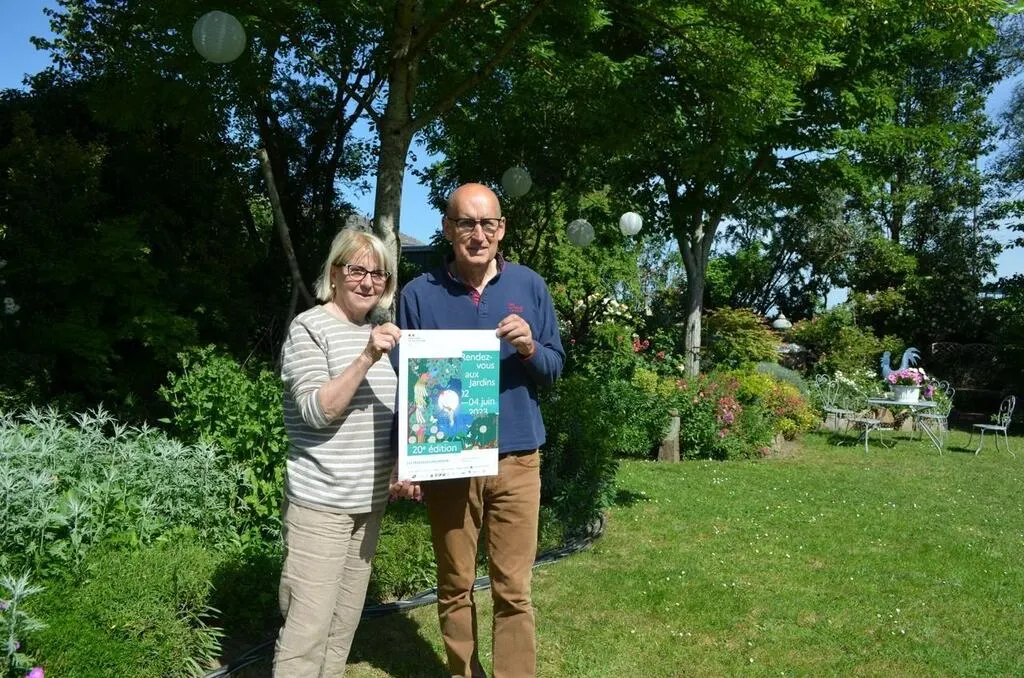 Michèle et Bertrand Garreau sont fin prêts pour accueillir les visiteurs dans leur foisonnant Jardin bleu à Laigné-en-Belin. © Le Maine Libre