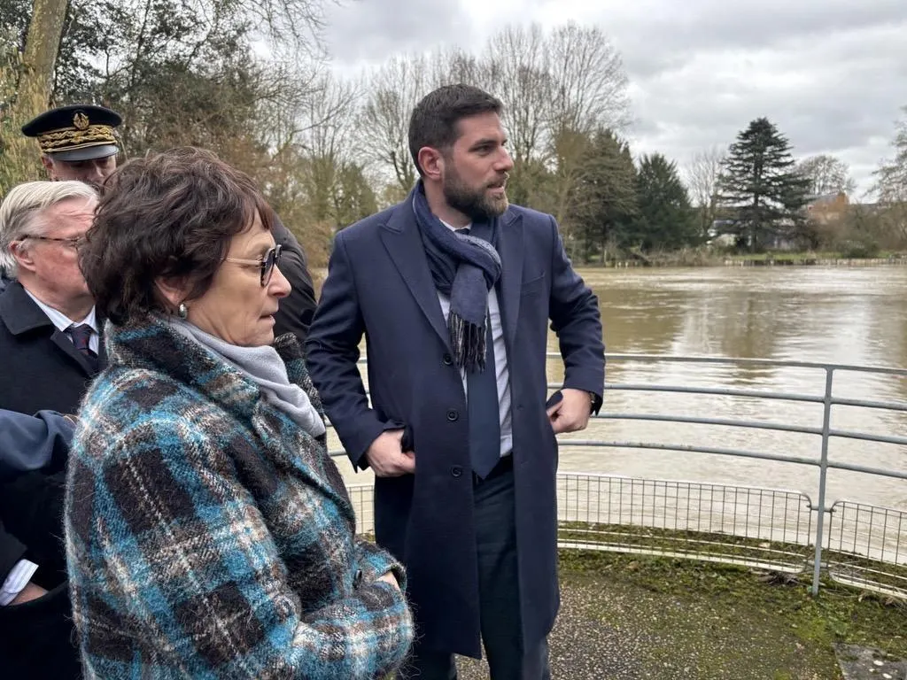 La maire Nadine Grelet-Certenais et le ministre Vincent Jeanbrun font un état des lieux de l crue du Loir, en vigilance orange ce jeudi. Ouest-France