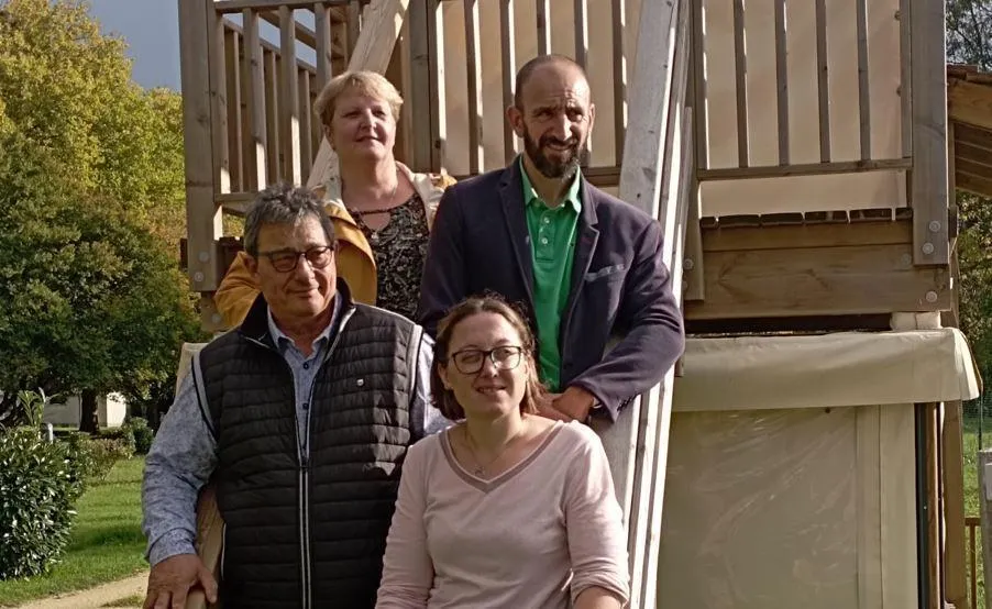 De bas en haut : Laurence Hutereau, adjointe au maire, et Loïc Bouchard, directeur du pôle attractivités à droite, Philippe Delaunay, adjoint au maire, et Flavie Blin co-gestionnaire du camping, au pied d’un logement locatif. © Ouest-France
