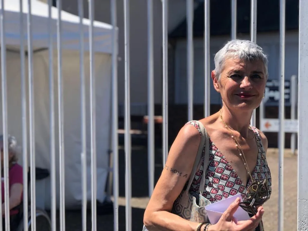 , petit haut fleuri et coloré, doigts vernis de rouge, Andrée, 92 ans, arrive en fauteuil roulant devant les grilles de l’Ehpad Irène-Joliot-Curie, au Mans.