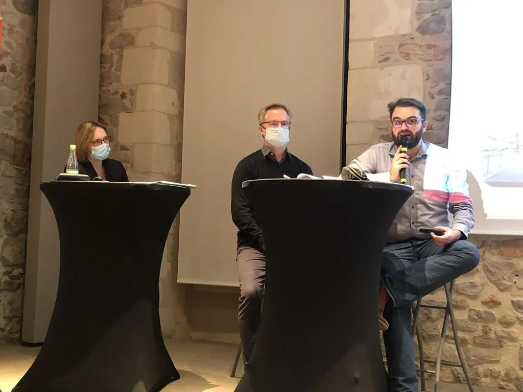 Valérie Boyer, animatrice de la réunion publique Chronovélo, jeudi 17 février 2022, en compagnie de Ronan Thiébaut, chef de projet Chronovélo et Kévin Hellequin, chargé de mission mobilités transports Le Mans métropole. © Ouest-France