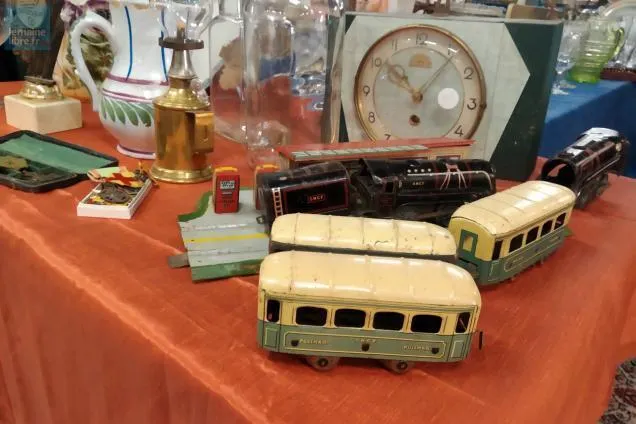 Une machine à vapeur pour expérimenter. « On fait chauffer l’eau à droite et la vapeur va faire tourner la roue qui est à gauche. Ça peut intéresser un collectionneur de vieux jouet pour enfants ou quelqu’un qui va être intrigué par l’objet qui date de la fin XIXe, début XXe. Il lui manque les connexions entre le bac à eau et la roue, on l’a récupéré au hasard chez un particulier. Donc incomplet, cet objet peut se vendre 400 €. »