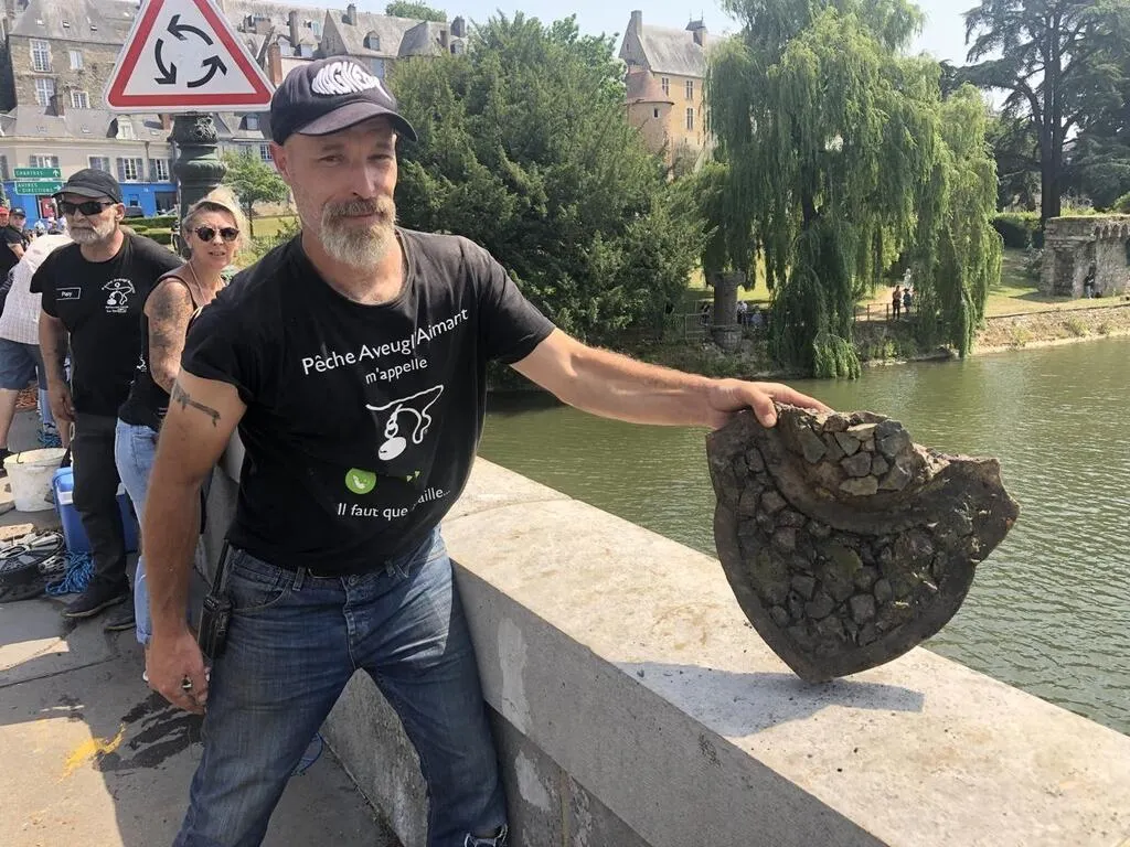 Jean-Philippe Brasier et les membres de l’association Pêche Aveugl’Aimant ont retrouvé une partie du blason du pont en X (ou de l’ancien pont Yssoir), parmi d’autres morceaux métalliques repêchés ce dimanche 19 juin. © Photo Le Maine Libre