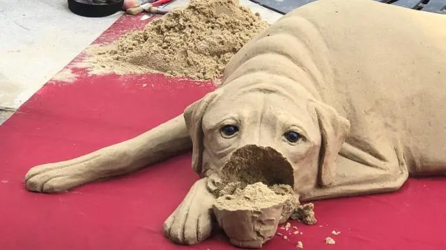 L’artiste tente d’humidifier la truffe du labrador, mais le postiche de sable ne tient pas. Il est embêté. Et le public l’est pour lui. Même si tout le monde sait que c’est une œuvre éphémère.
