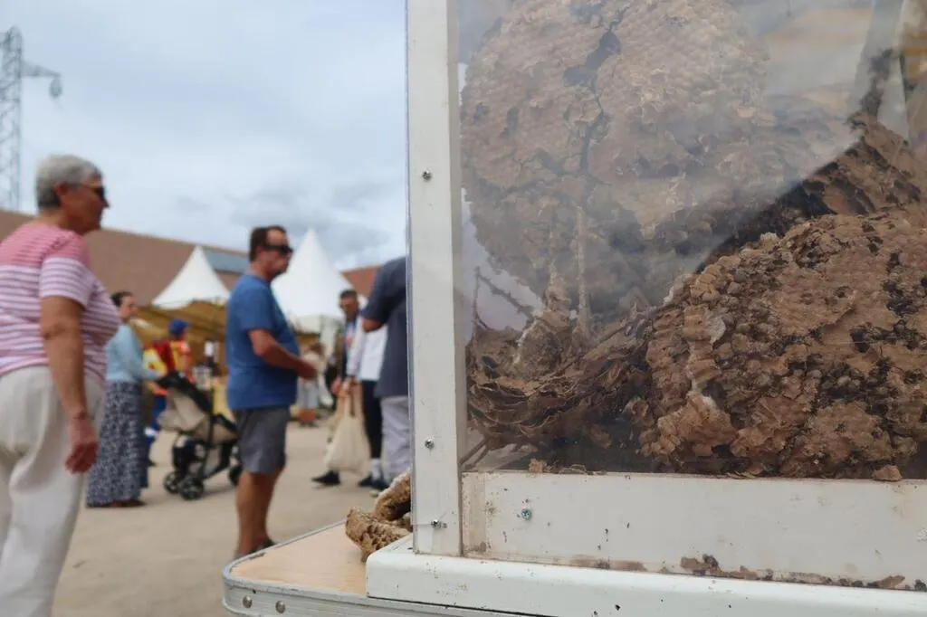 Un couple se présente au stand du syndicat, et pose une question à Alain Rouillard, un des autres bénévoles du syndicat. On a retrouvé ce nid dans le garage de mon frère, c’est des frelons ?