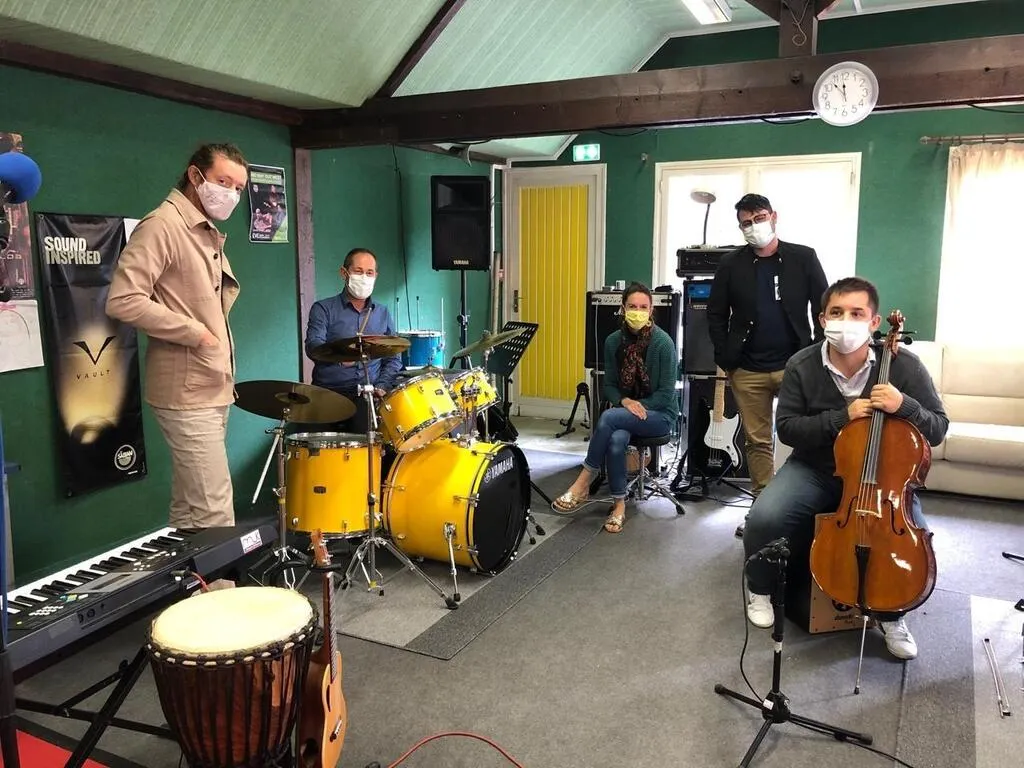 Le Mans, mardi 8 septembre 2020. Romain Guérard, coordinateur des ateliers, Jean-Yves Breteau, responsable de Radio Alpa, Mélinda Devanne, chargée de communication, Rodolphe Pereira, directeur des Cinéastes et Yoann Puech, directeur de la MJC Prévert, préparent cette rentrée particulière. © Le Maine Libre