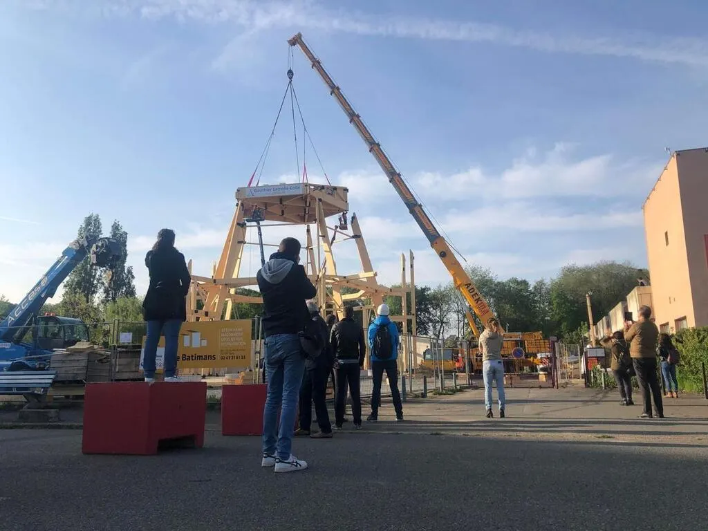 Sous les yeux réjouis des salariés de la cité du cirque du Mans et du service culturel de la ville, le sommet de la charpente du futur chapiteau permanent a été posé ce mercredi 27 avril 2022.