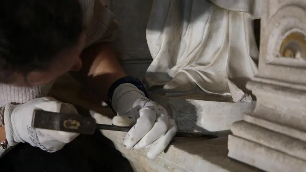 Justine Sacleux, restauratrice, a retiré la Vierge à l’enfant de son retable de la chapelle des fonts, à La Couture. Elle procède ici à la dernière étape de l’opération : dépoussiérer l’œuvre. © Ouest-France