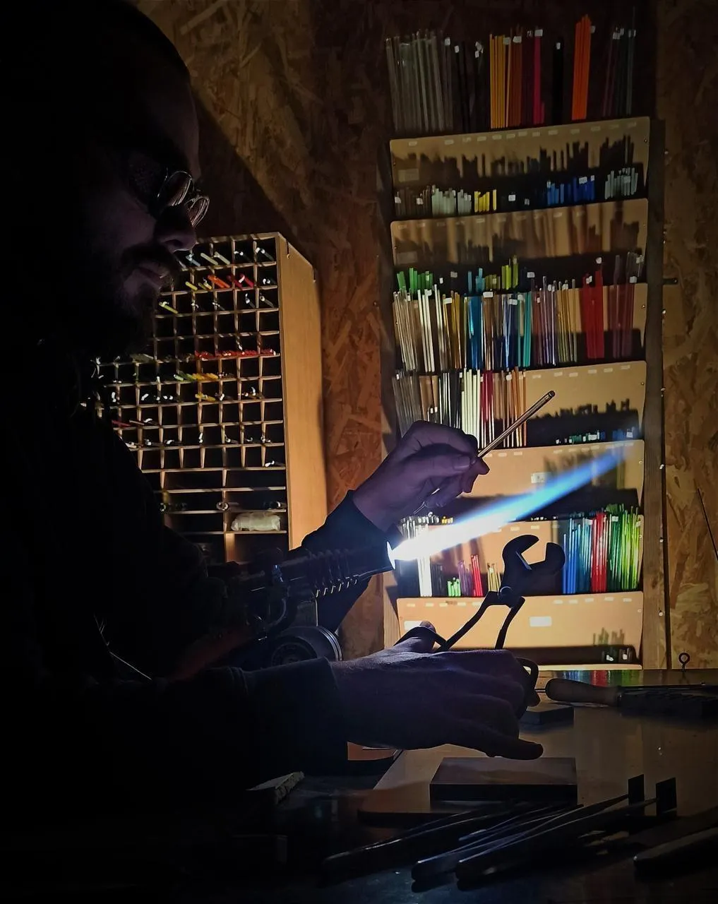 Sunny Bodereau travaille le verre au chalumeau, à partir de fines baguettes qu’il fait chauffer jusqu’à 1 200 °C. © Sunny Bodereau