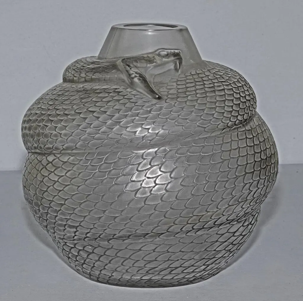 Autre bel objet, un vase serpent Lalique, en verre soufflé-moulé à patine grise, estimé entre 6 et 8 000 €.