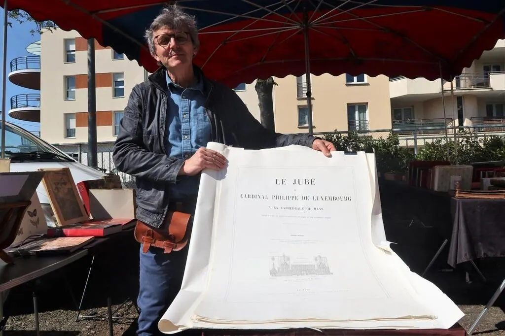 Bouquiniste originaire de Sainte-Suzanne, Loïc Lebourdais présentait un grand livre relatif au jubé de la cathédrale du Mans, lors du premier rendez-vous de « Lire au port ». © Archives Le Maine Libre
