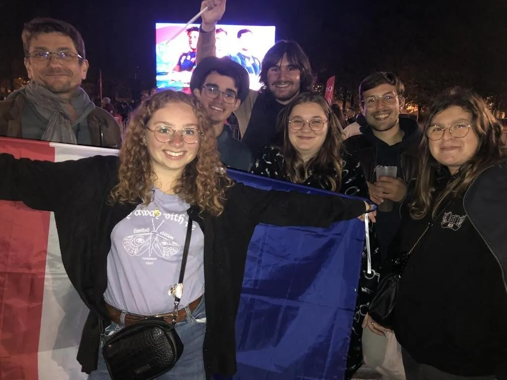 Eva, Clément, Manon, Audrey, Hugolin, Quentin, étudiants à la fac du Mans, et leur professeur d’histoire, rencontré par hasard, devant l’écran géant. © Ouest-France