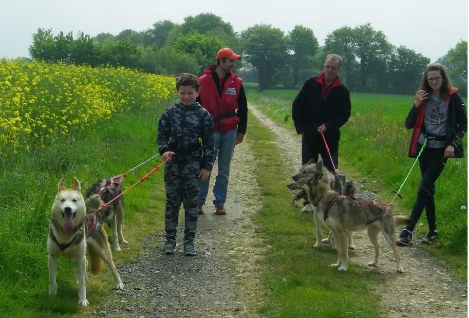 La cani-rando est une marche d’une heure ou deux au cours de laquelle les participants sont harnachés à un chien de race husky de Sibérie. © Association des crocs blancs sarthois – cani-rando