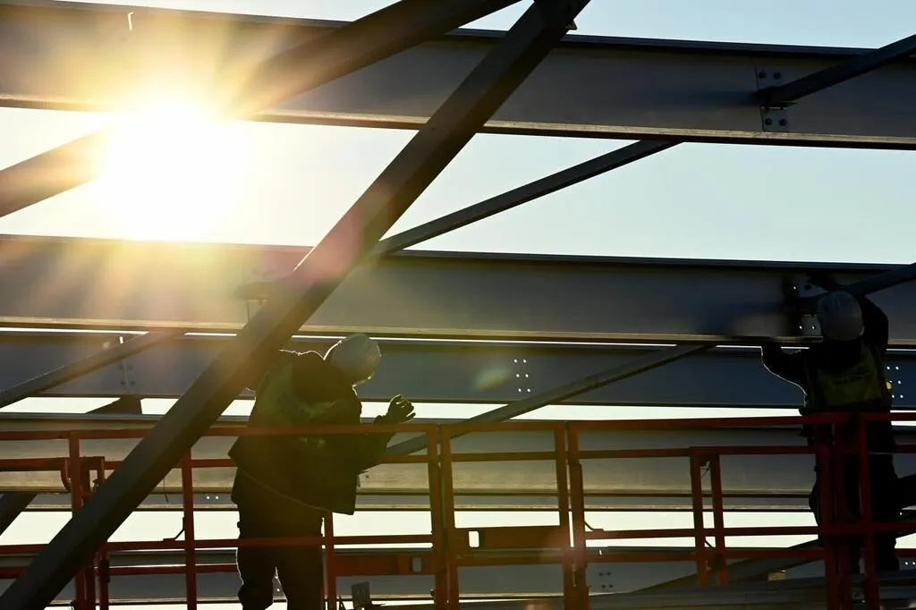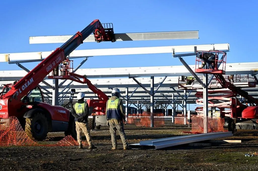Lancé cet hiver, avec la pose des armatures, le chantier (ici, le 14 janvier 2022) a vite avancé. La mise en service est prévue avant l’été. Outre la production d’électricité, les ombrières permettent de protéger les voitures de la pluie et du soleil. © Marc Ollivier/Ouest-France