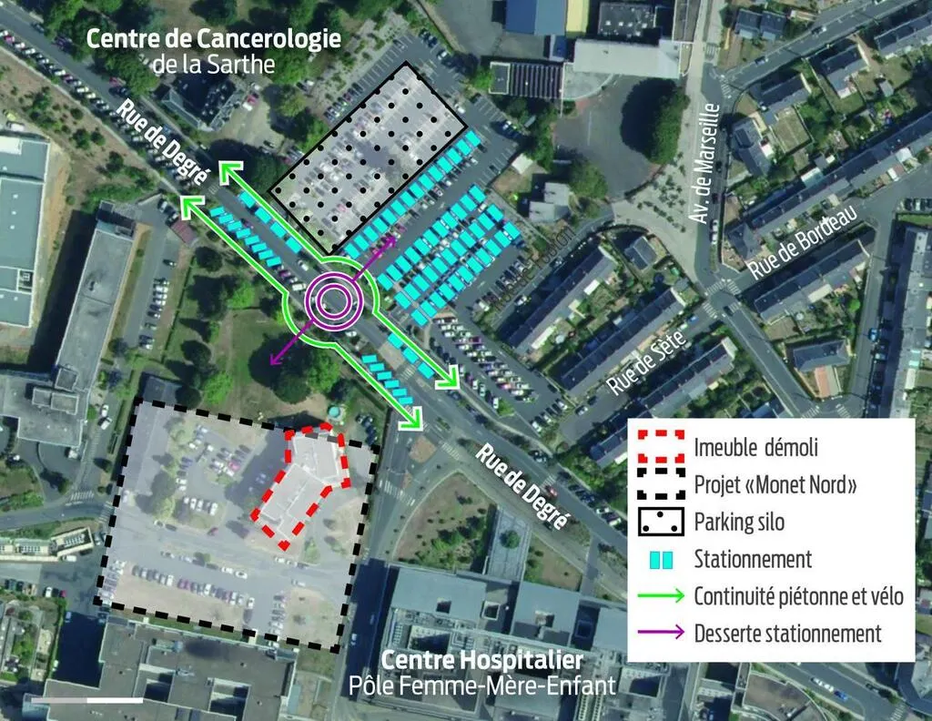 Le Mans métropole envisage la création d’un parking en silo de trois étages à proximité du nouveau centre de cancérologie du Mans, et va proposer une navette afin de fluidifier la circulation dans le secteur de la route de Degré aux abords du centre hospitalier.