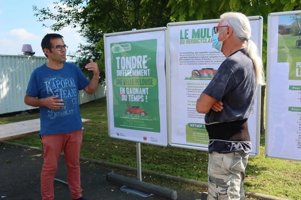 Sur l’espace déchets verts de la déchetterie intercommunale de Sablé, trois personnes haranguent les passants. Valérie You, chef du service environnement à la communauté de communes du Pays sabolien, Pierre Paterne, vice-président en charge de l’environnement, et Damien Jubault, éco-conseiller, sensibilisent le public au mulching. Derrière eux, des panneaux expliquent cette démarche et une vidéo tourne en boucle pour détailler ses avantages : Le mulching permet d’éviter de ramasser l’herbe tondue : elle est broyée par les lames mulching et reste ainsi sur le sol. Elle enrichit la pelouse et la fertilise ».
