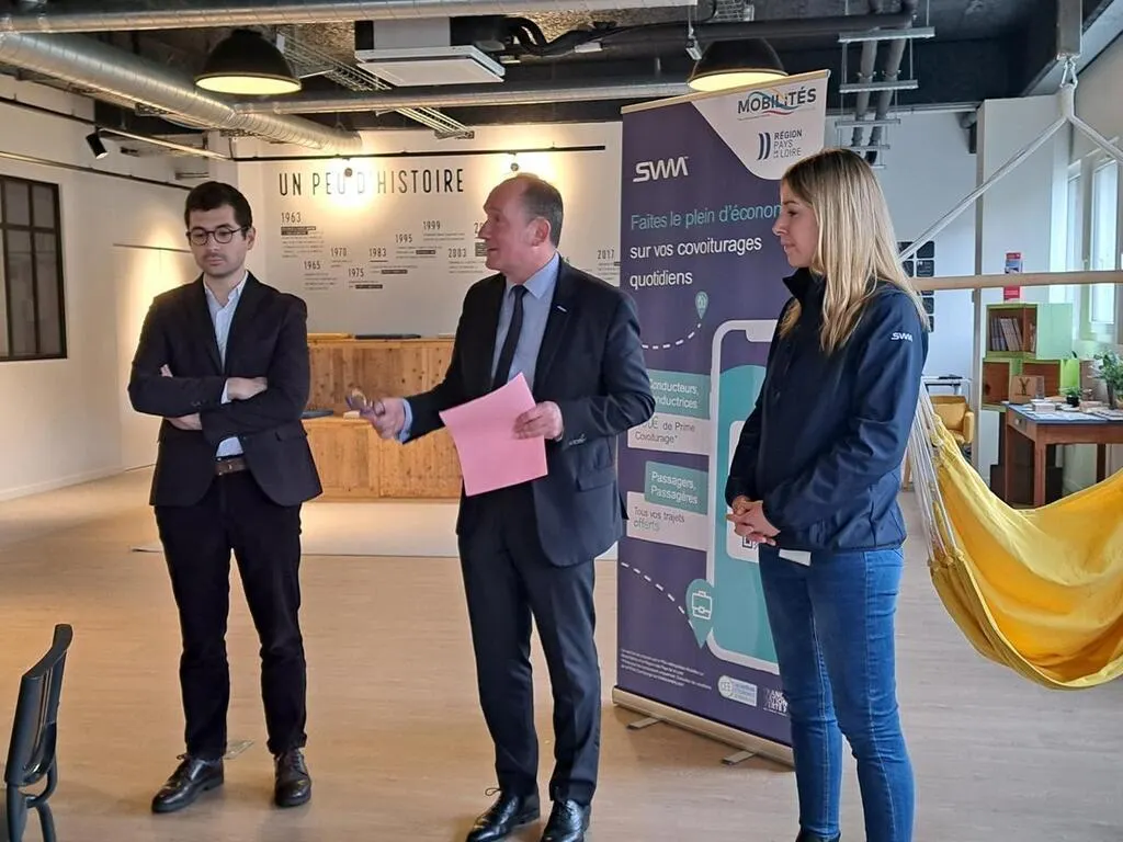De gauche à droite : Hugo Brahmi, directeur régional de BlaBlaCar Daily, Emmanuel Franco, vice-président du Pôle métropolitain mobilités Le Mans-Sarthe et Julie Lamy, directrice de l’entreprise LTR de Spay. © Ouest-France