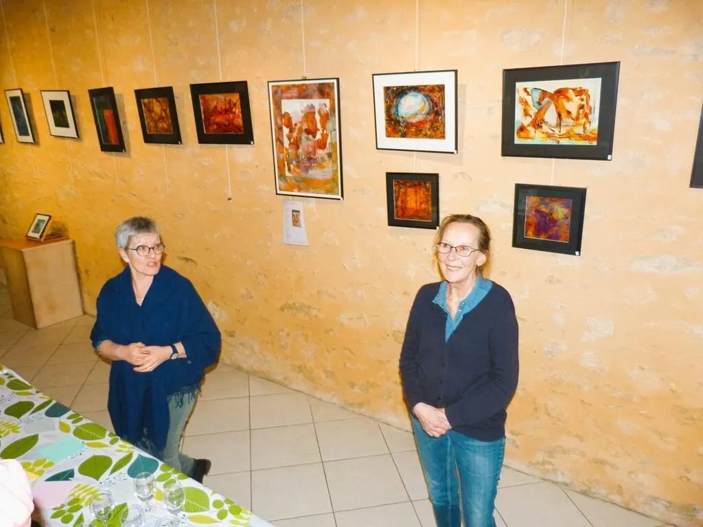 À gauche, Martine Germain, 3e maire adjointe en charge de la culture, présente au public Sylvie Grich, artiste peintre et écrivaine, devant ses nombreuses Å“uvres. © Ouest-France