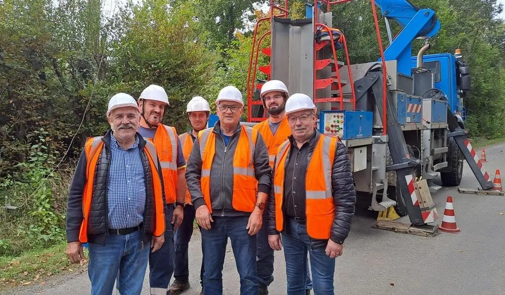 De g. à dr : Michel Lalande maire de La Bazoge et son adjoint Jean-Yves Alibi, Jean-Luc Suhard maire de Sainte-Jamme-sur-Sarthe, avec des membres de l’équipe d’Enedis, sur le chantier route de Souillé. © Le Maine Libre