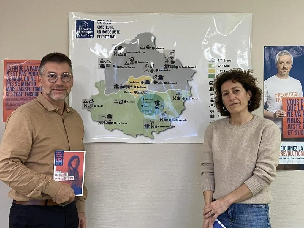 François Soulard, délégué départemental du Secours catholique et Anne-Sophie Hébert, la présidente. © Photo : Le Maine Libre