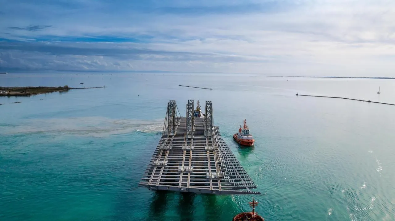 photo  le tablier posé sur la barge, accompagné de remorqueurs au départ de montfalcone, en italie.  ©  gael arnaud - cimolai 1