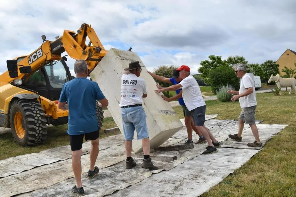 Des bénévoles viennent d’installer les imposants blocs pierre pour le symposium de sculpture monumentale sur pierre et métal qui est programmé du 5 au 20 juillet au gîte de la Métairie :  Parmi les 80 candidatures, nous en avons retenu cinq. Il nous fallait tenir compte du budget. Nous avons installé trois blocs de pierre calcaire de Tercé de deux mètres de hauteur pesant environ chacun 3,5 tonnes.Â