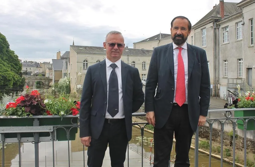 Raymond de Malherbe (cravate rouge) avec son suppléant Fabien Carton, à Sablé-sur-Sarthe, vendredi 3 juin 2022. © Ouest-France