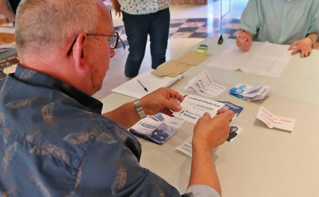 Un bulletin du Rassemblement national lors du dépouillement dans le bureau de vote n° 1 près de la mairie de Sablé-sur-Sarthe, dimanche 12 juin 2022, au premier tour des élections législatives. © Ouest-France