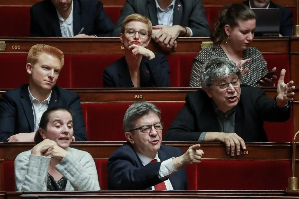 Les députés LFI (de bas en haut et de gauche à droite) Caroline Fiat, Jean-Luc Mélenchon, Adrien Quatennens, Éric Coquerel, Clémentine Autain et Mathilde Panot, le 25 février 2020. © LUDOVIC MARIN / AFP